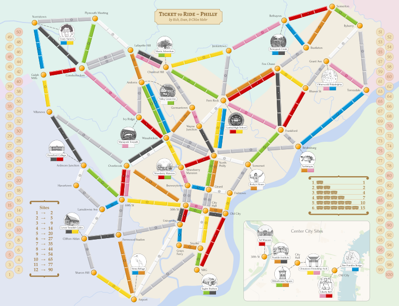 Our family loves the board game Ticket to Ride, where you build a railroad network to connect cities. Since we're also big fans of Philadelphia and public transit we were inspired to create a Philly version of the game!